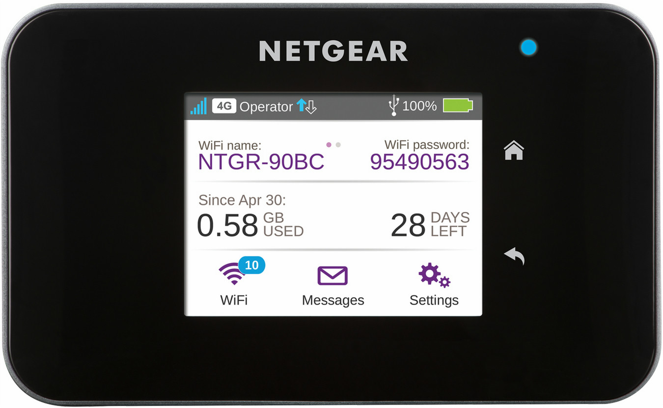 The NETGEAR® AirCard® 810 Mobile Hotspot gives you super-fast 4G LTE and 3G speeds anywhere, up to 600Mbps. Receive SMS messages & monitor data usage on the color LCD touchscreen. Jump Boost lets you charge your smartphone or tablet. You can share a connection with up to 15 WiFi devices.