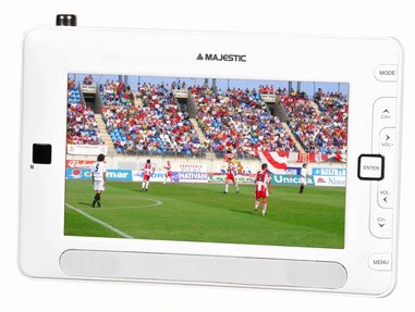 New Majestic TVD-734WH. Display technology: LCD. Tuner type: Analogue & Digital, Analog signal format system: NTSC, PAL, Digital signal format system: DVB-T. Video formats supported: MPEG, Audio formats supported: MP3, WMA, Image formats supported: JPG. Power source type: AC, Cigar lighter. Battery technology: Lithium-Ion (Li-Ion)