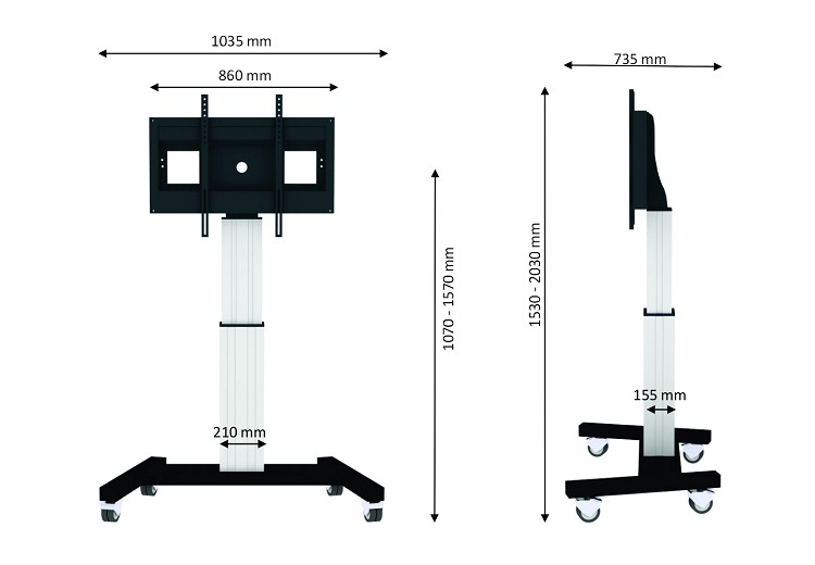 Easily roll this cart over doorways and thresholds with to the high quality wheels. The mobile electric floor lift is automatically height adjustable over a height of 50 cm with a remote control. From the floor to the center the distance of the screen is variable from 101 cm to 157 cm.