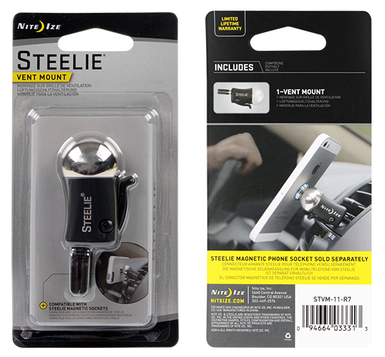 The Steelie Vent Mount Kit is a brilliant solution for keeping your smartphone secure and visible when you're in the car - any car. It consists of two simple components: 1) a Steelie Magnetic Phone Socket that adheres semi-permanently with 3M® VHB™ foam tape, either to the back of your case or to the phone itself, and 2) a versatile Steelie Vent Ball Mount that securely clips to most vehicle vents, and is just as easy to unclip, so it can be used in multiple vehicles. The Vent Ball's round shape allows radiant positioning options, so you can tilt your phone to any angle, and the strong magnetic attachment of the Steelie Phone Magnet Socket keeps your phone securely in place and where you need it.