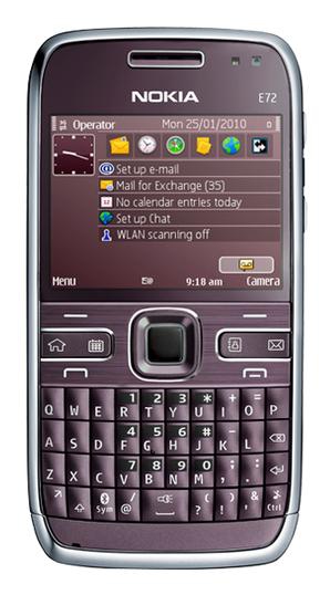 E72, 5.9944 cm (2.36 ") TFT, 320 x 240, 5.0MP, EGSM 850/900/1800/1900, 250MB, 802.11 b/g, Bluetooth 2.0+EDR, USB 2.0, A-GPS, 128g, Amethyst Violet