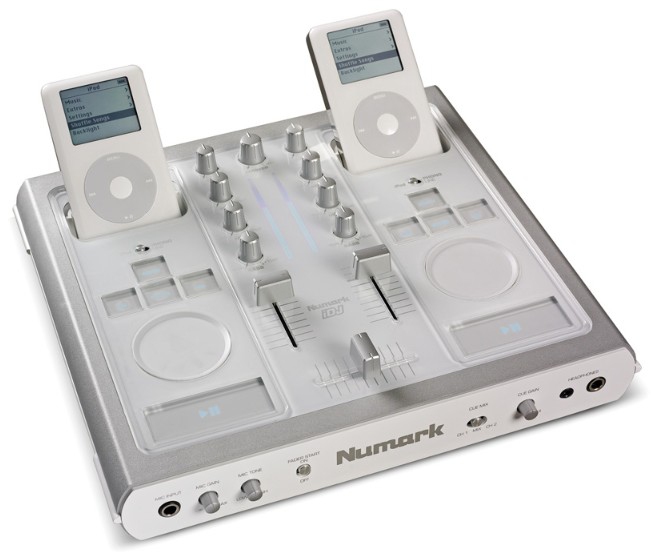iDJ, the first DJ mixing station for iPod, is a two-channel DJ mixer with two Universal Docks for iPod. You can dock and mix tracks from two different iPod, CD players or turntables connected to iDJ's inputs, or a combination of those sources. You can also mix in a mic and sing, rap, or talk over the music with iDJ's mic channel.