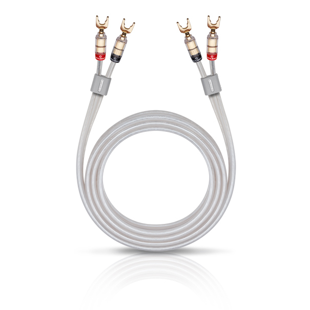 Loudspeaker cable, silver-plated, 2x2.5 mm², with Solution lug, 5m, transparent Excellently coordinated loudspeaker cable for connecting AV receivers or amplifiers and loudspeaker boxes. The cable is preassembled with Oehlbach Solution cable-shoe connectors to allow convenient connections and guarantee a stable quality of transmission. The sophisticated star-shaped air tubes located in the two conductors and in the central separator deliver two benefits: on the one hand, the cable becomes very stable without loss of flexibility and, on the other, both cable leads have been arranged precisely to the millimetre in relation to each other, which results in outstanding electrical parameters. Which means that air is actually used as the perfect insulator in the Crystal Silver Star. The clever stranding of the 50 individual silver-plated inner conductors, each measuring only 0.254 mm, effectively minimizes the skin effect.