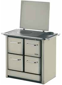 Enamelled steel body. Cast iron firebox and front. Large firebox and oven. Vitreous enamel cast iron front. Plate frame, fire screen, Towel rail support and grate in cast iron. Inner plates and rings in polished cast iron. Ash drawer. Oven thermometer. Enamelled oven and tray. Chrome-plated handles and towel rail. Hot water tank and ladle (optional)