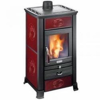 12 / 8.9 kW, 210 m3, furnace volume - 50 dm3, efficiency - 74%, wood drawer, 150 kg, black / bordeaux