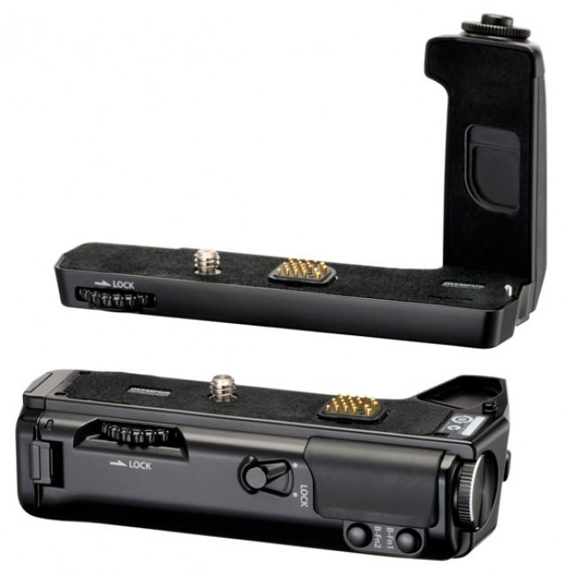 The landscape unit includes a built-in shutter button as well as a dial for locking the grip onto the bottom of the E-M5.