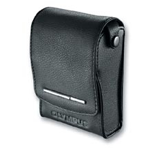 Stylish black leathercase in camera shape, equipped with a belt attachment, a compartment for 2 xD-Picture Cards and a hanger for the handstrap.