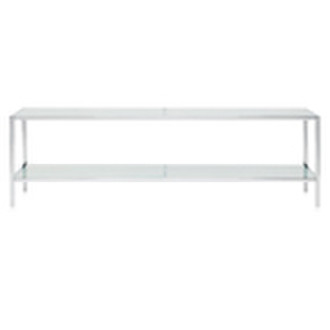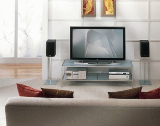 Steel and glass are contemporary standards. Here the steel is chromed, the tempered glass frosted. Cooly elegant, the look is elegant without being intrusive. A middle shelf, also tempered glass, holds additional components.