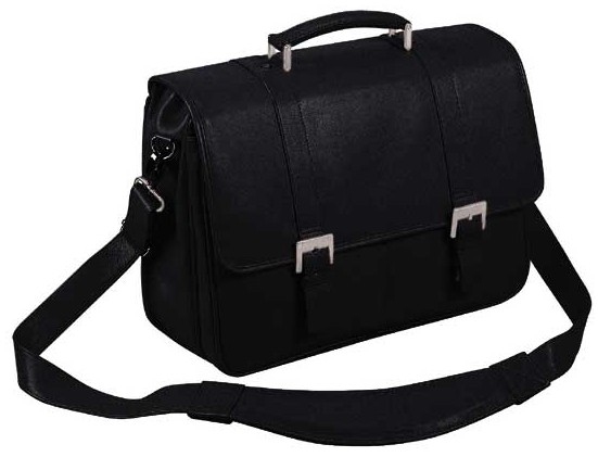 Double compartment bag realised in "Montana" leather with satined accessories. Double compartment and front pockets, rear pocket with magnetic button, pull-out case for 14" laptop with handle, removable shoulder. Possibility of insertion on trolley.