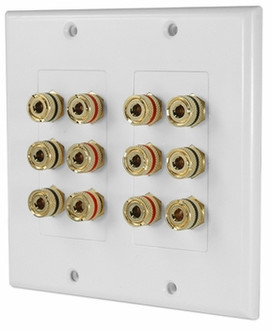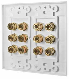 This sturdy and attractive wall plate allows up to 3 pairs of speakers to be connected (from behind the wall) to a single stereo amplifier. The removable 4-pin screw connectors simplify speaker wiring and keep all those messy cables tucked neatly away from view.