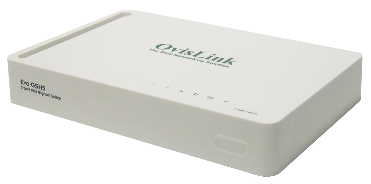 With the EVO-GSH5 switch, OvisLink offers a powerfulpure Gigabit switch of strong services and at a veryeconomic price. This device is equipped with 5 Gigabit RJ45 ports and a potent backbone memory that canconnect computers and network devices at 1000 Mbps., which means that sharing files and multimedia devices isas rapid as if they were in the local PC. With the addedadvantage of using the standard Cat. 5 cable and beingperfectly compatible with 10/100 Mbps devices.