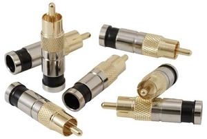 Compression RCA connectors for RG59 and RG59 Quad cables. Jar of 50 connectors and 5 sets of color bands.