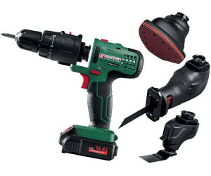 Remark: 4 in 1: Drill driver, multi-sander, reciprocating saw, and multifunction tool / Included accessories: 6 drill bits (1.5/2/3/4/5/6 mm) / 6 screwdriver bits (approx. 50 mm) / 1 bit extension (approx. 50 mm) / 5 sanding sheets (2x K 60, 2x K 120, 1x K 240) / 1 metal saw blade (HSS 150 / 18 TPI) / 1 wood saw blade (HCS 150 / 6 TPI) / 1 HSS plunge saw blade / 1 scraper knife / 1 delta sanding plate / 3 sanding sheets (1x K 60, 1x K 80, 1x K 120)