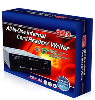 PEAK All-in-One Internal Card Reader, with 4 card slots and 1 extended USB port, is designed for Desktop Computer to use. The latest chipset of the card reader/writer can read most of the flash cards in market, including all the series of Compact Flash, IBM MicrodriveTM, Smart Media, Secure Digital, Secure Digital High Capacity Card, MultiMedia Card, Memory Stick and all the other flash cards. (Adequate adapters may need)