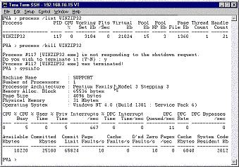 Perle WinAttach gives access to any Windows NT or Windows 2000 system via the COM port as a reliable backup access in the event of a failure on the LAN or with the GUI. With a Perle CS9000 and WinAttach's rich set of emergency management commands, most Windows systems can be repaired and then recovered without the need for a reboot. As an example, what happens if a process has hogged the CPU and in effect locked the GUI and denying access to repair. By using a CS9000 and WinAttach, access can be gained via the COM port and the offending process can be killed.