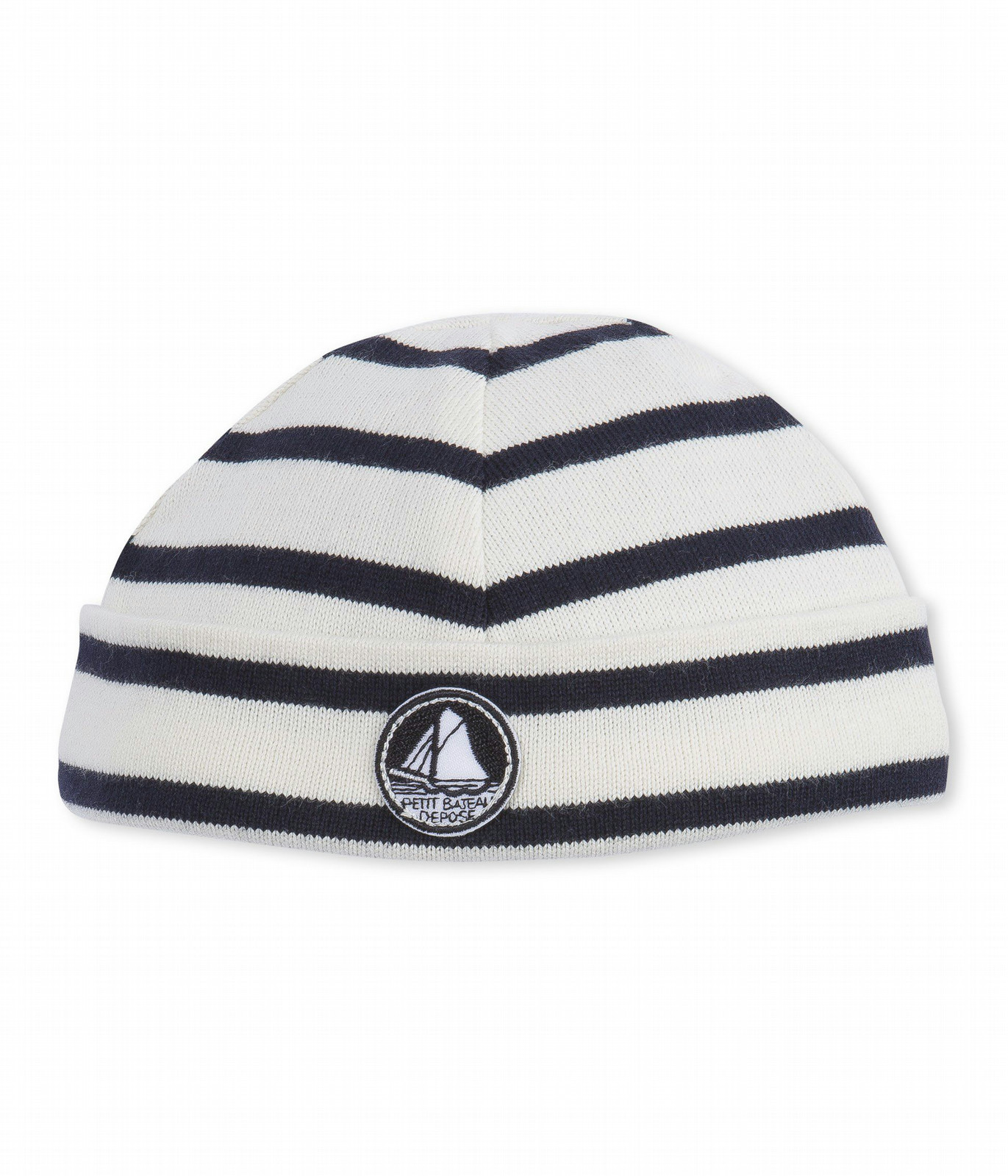This baby boy's sailor hat is a key accessory in a mid-season wardrobe. An iconic Petit Bateau item, it's made in heavy jersey, a soft, supple and robust material, and features the famous sailor stripe accented with a sailboat badge. Material: 100% cotton