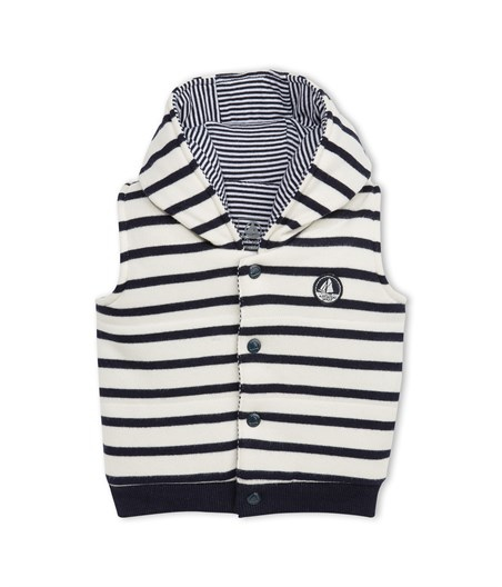 This baby boy's sleeveless jacket is padded and quilted and fastens at the front with snap buttons. As an added bonus, the jacket is reversible, sailor-striped on one side, and milleraies-striped on the other. Note the plain ribbing and the iconic sailboat patch badge detail on the chest. A perfect jacket over a sweater or sweatshirt when the weather turns colder.