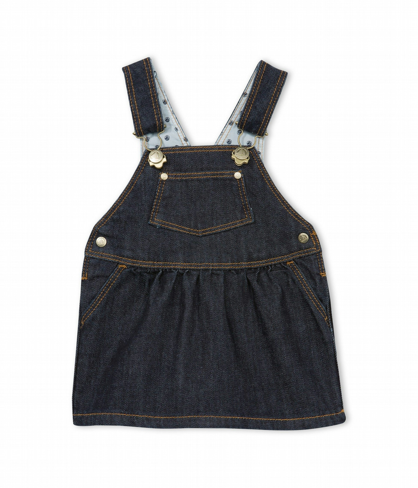 This baby girl denim pinafore dress has a bib with strap hooks and metal logo buckles. A patch pocket decorates the centre of the bib. The skirt has gathers all around the waist and small patch pockets on the back. Note the Petit Bateau logo lining. An irresistible contemporary-looking dress, practical for everyday wear.