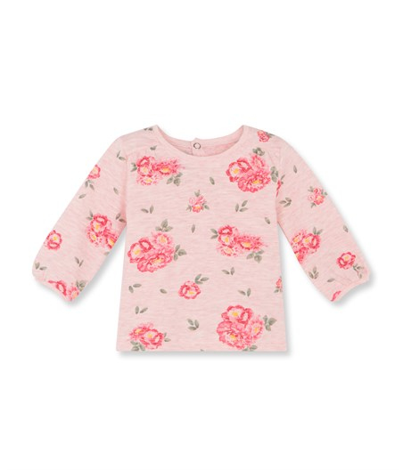 Made in mottled jersey, this baby girl's blouse features a print decorated with big, romantic flowers. The cuffs are edged with gathers. The shoulder seam is slightly forward and gathered for more femininity. A truly charming baby blouse.