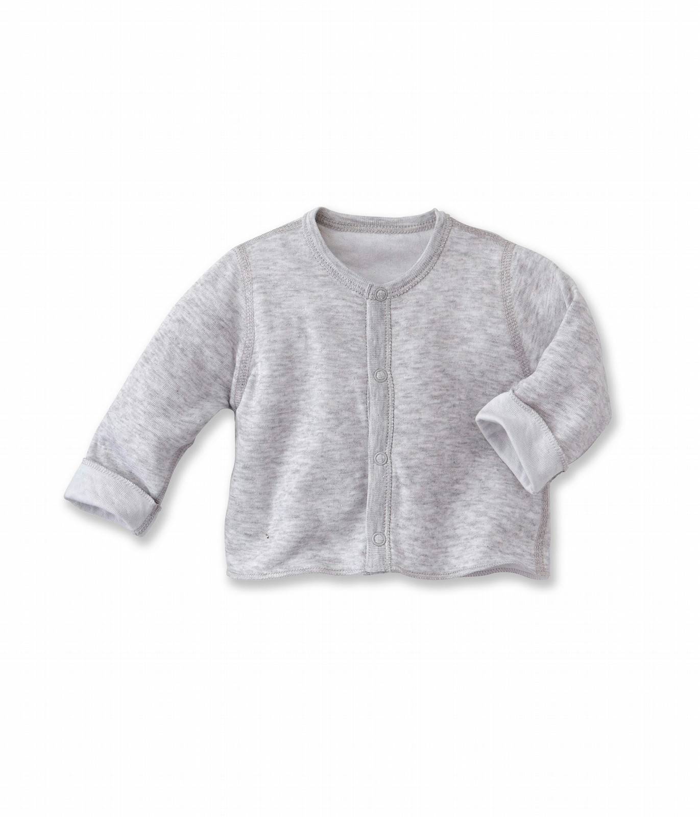 This reversible baby cardigan crafted in plain tube knit plays on a modern register with flat stitching and a streamlined design. A snap closure makes it easy to dress baby in this essential piece. This unisex model can be dressed up or down, and it is easy to coordinate with various outfits from the collection.