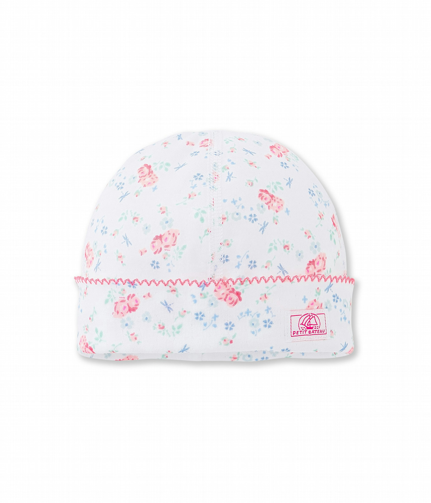 This newborn baby girl hat is made in a lovely flower print tubic cotton with cuff and accents in fluorescent picots. A perfect hat to slip in a baby girl's layette. Fabric: 100% cotton