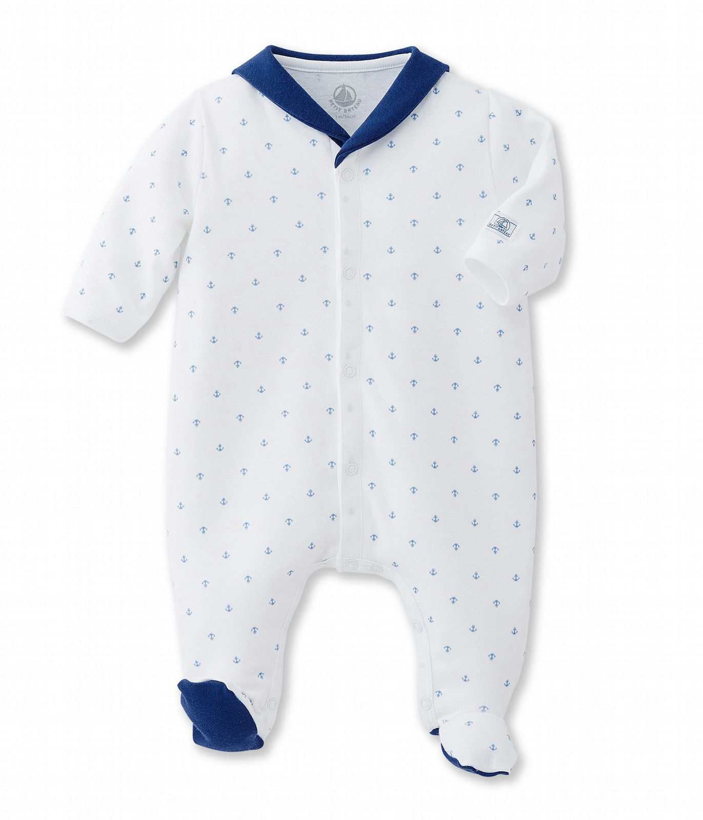 Made in a fresh and modern anchor-print cotton, this baby boy sleepsuit has a snappy sailor collar and soles in a plain contrasting colour. Note the front fastening with poppas on the front of this baby pajama. A light sleepsuit with a sailor look for the summer! Fabric: 100% cotton