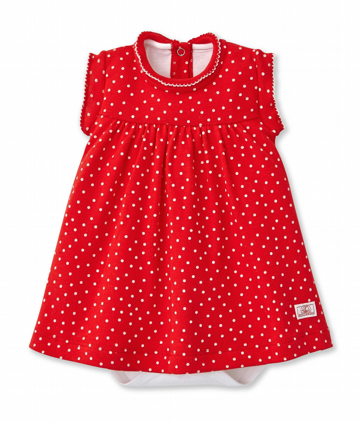 3m, girl bodysuit dress, 100% cotton, red/white You won't resist this baby girl bodysuit dress made in 1x1 rib. The dress part is printed with polka dots, and the bodysuit is plain. Note the little sleeves and the ruffled neckline with raw edging and the gathers on the chest for a pretty volume. A refined bodysuit dress, ideal for summer.