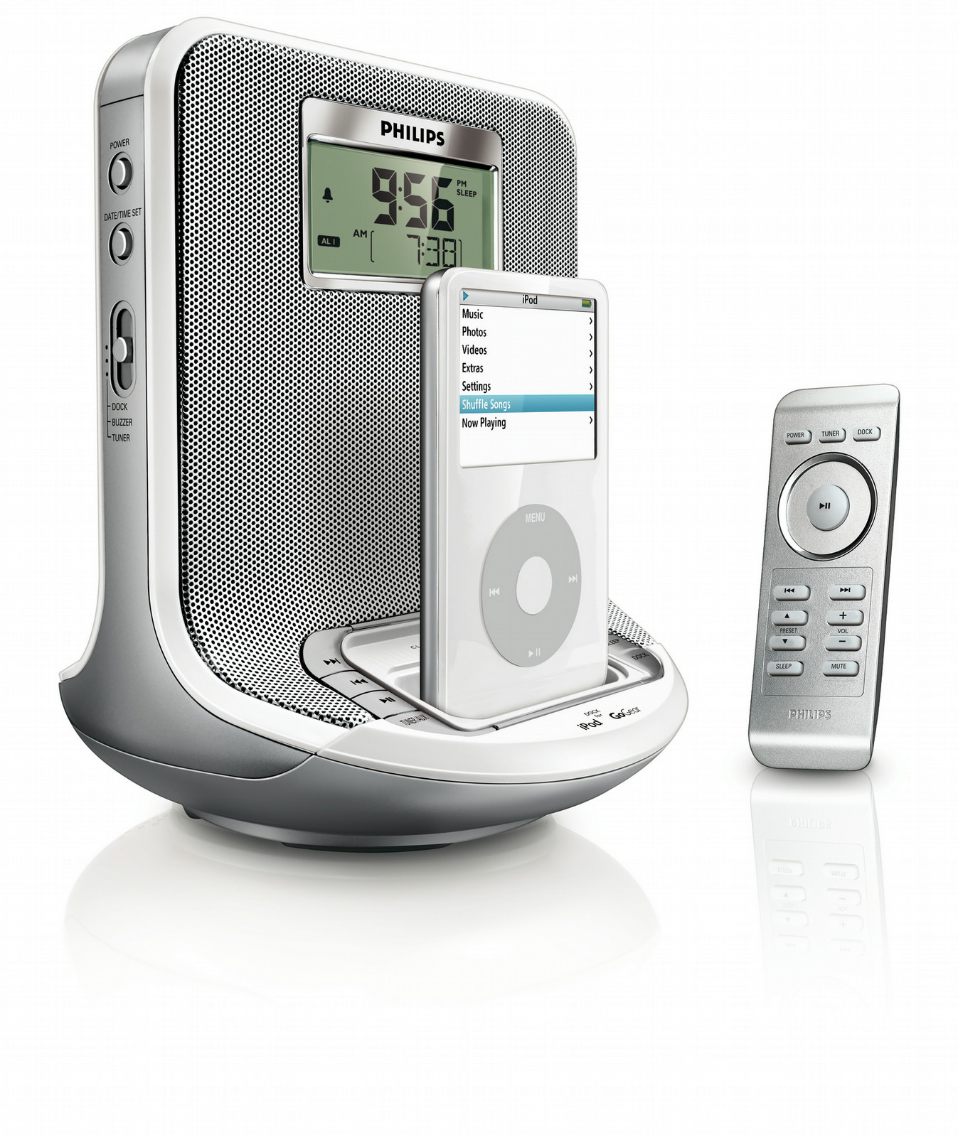 Free your portable music at home! Dock your iPod or GoGear player into the compact AJ300D Docking Entertainment System with powerful bass supported by 12W RMS power. Enjoy great sounds and choose to kick-start each day with music.