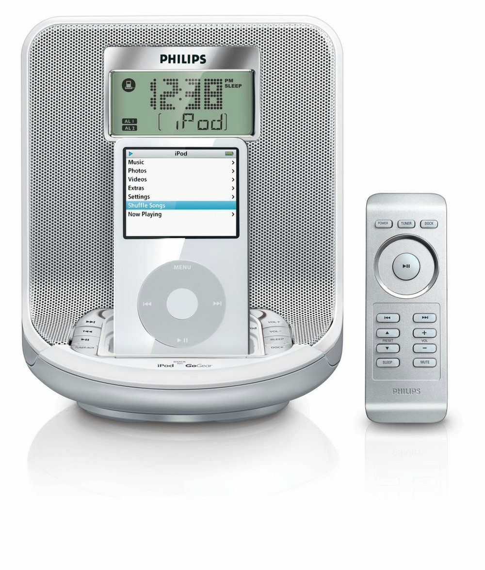 Free your portable music at home! Dock your iPod or GoGear player into the compact AJ300D Docking Entertainment System with powerful bass supported by 12W RMS power. Enjoy great sounds and choose to kick-start each day with music.