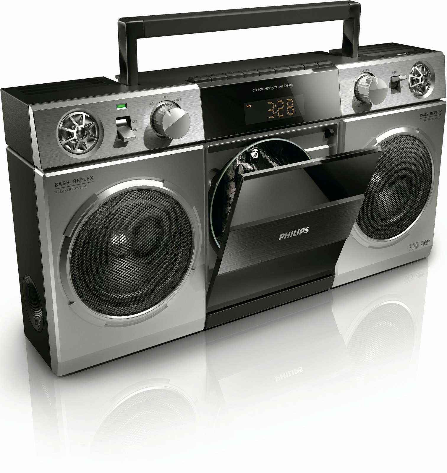 This retro-style boombox not only looks the part but plays music better & louder. Bass reflex technology gives you pumping, deeper bass & MP3-CD, USB connectivity give all the options you need to bring out the best in your music collection.
