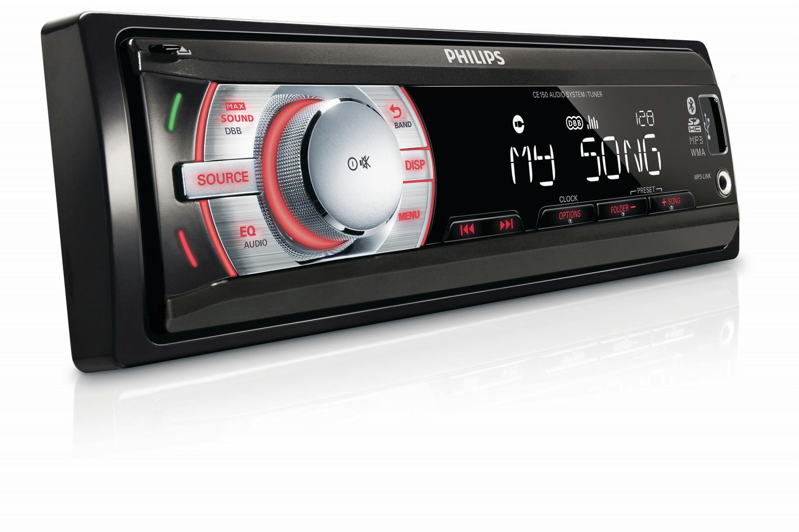 Philips CE150/55. Bluetooth version: 2.0+EDR. MP3 bit rates: 32 - 320 Kbit/s. Key illumination colour: Red