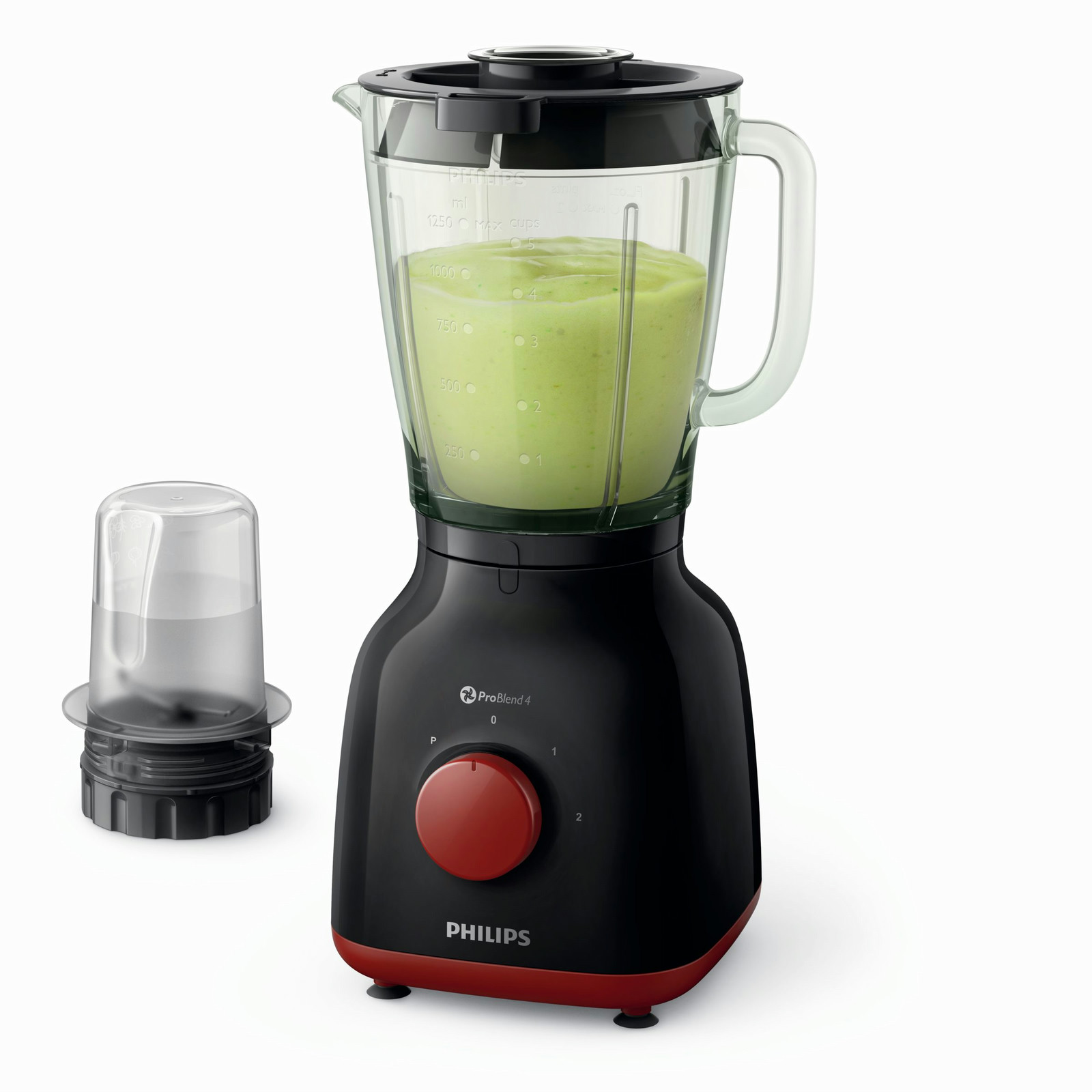 Philips HR2148/90, Daily Collection. Type: Tabletop blender, Bowl capacity: 1.25 L, Colour of product: Black, Red. Blade material: Stainless steel, Material jar(s): SAN, Housing material: Polypropylene (PP). Power: 500 W, AC input voltage: 220-240 V, AC input frequency: 50/60 Hz