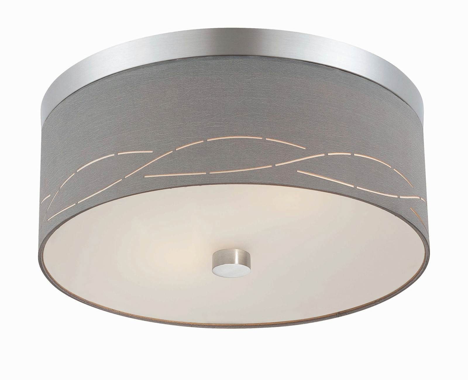 Two-light ceiling fixture in Satin Nickel finish with silver fabric shade.