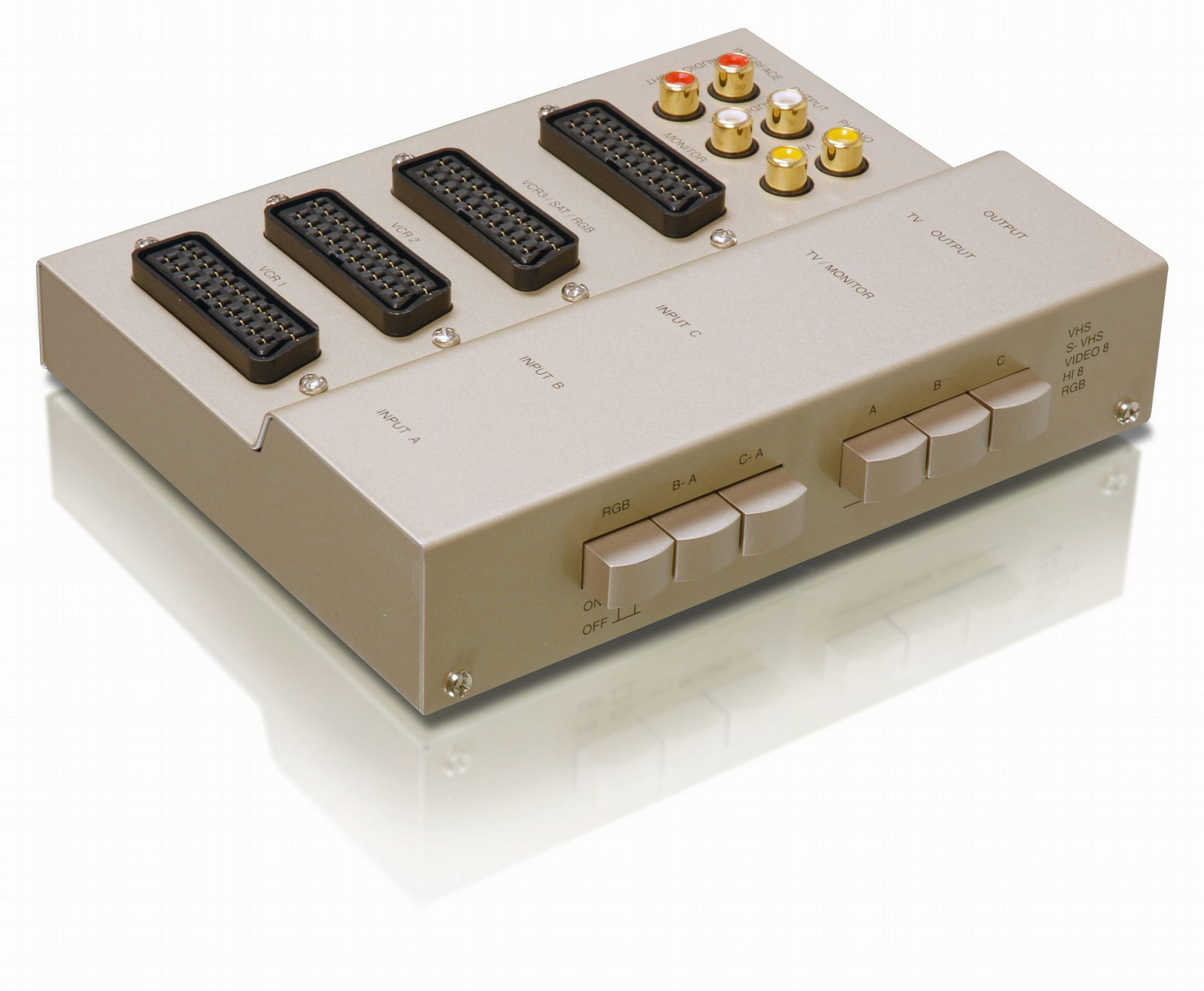 Turn up your viewing experience. With this 3-way manual switcher. 3-Way Composite A/V Connections.