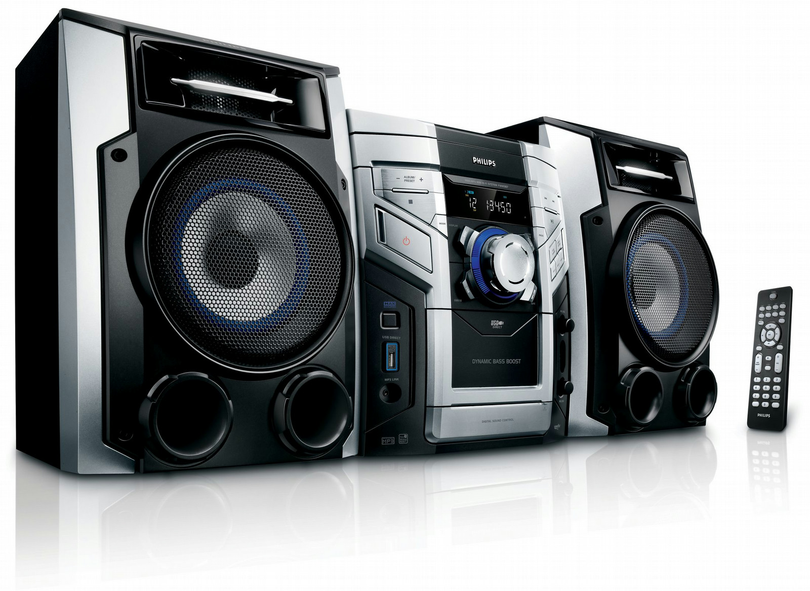 For unlimited music enjoyment, the FWM387 offers a 3-CD changer and allows you to enjoy your favourite MP3/WMA music collections directly from your portable USB device. Plus, Max Sound and Dynamic Bass Boost ensure great sound!