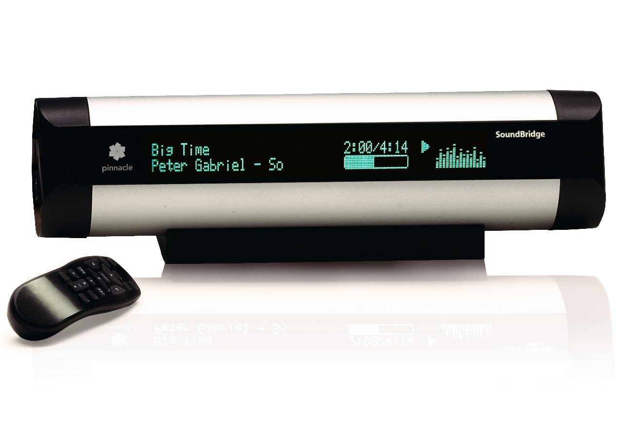 Here’s a network music player that looks as good as it sounds. Pinnacle SoundBridge plays your PC or Mac digital music files anywhere in the house – connecting your stereo or powered speakers to your computer’s digital music library. The SoundBridge is network–ready for wired Ethernet or Wi-Fi, and supports a large variety of standard and premium audio file formats. Pinnacle SoundBridge has the highest format compatibility of any networked player on the market today.