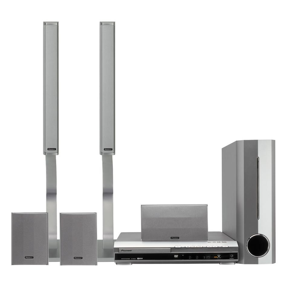Here 's a slim, stylish single DVD-Video player combined with a speaker set which includes two slender front speakers with speaker stand, adjustable in height to better fit with your TV. Good looks are a given, thanks to the aluminum half mirror effect on the front panel. Its super-slim subwoofer is compact enough for flexible installation —either horizontally or vertically — and this system offers flexible playback, including MP3. The DCS-505 headunit has a 5.1-channel amplifier with a total of 450 W (75 W x 6)RMS, plus an RDS Tuner and a DTS Decoder built right in. Dolby Digital and Pro Logic II offer you great surround sound possibilities. Pioneer even added Virtual Surround Back, giving this combination a broad variety of advanced surround sound modes.
