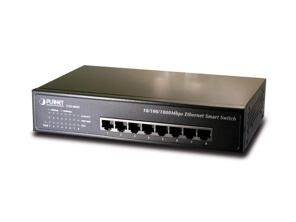 GSD-800S - 8-Port 10/100/1000Mbps, Auto-MDI / MDI-X, Full-Duplex, 8K MAC, 16Gbps, Jumbo Frame, Layer 2, Multicast, QoS, 8.7 W, 1.1 kg