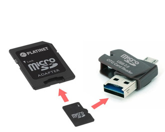 The set 4 in 1 for Tablets, smartphones, mobile phones, PCs, digital cameras and other devices with USB, microUSB, SD or microSD ports. Transfer data directly via a microUSB port or USB card micoSD. MicroSD card slot, which is a storage medium, has been hidden at the end of the USB. By this the adapter is gaining additional function Plug & Play USB pendrive.