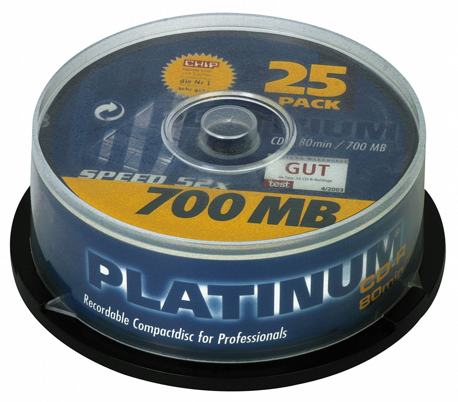 Platinum CD-R 52x 700MB 25pcs. Type: CD-R, CD storage capacity: 700 MB, Quantity per pack: 25 pc(s). Package type: Cakebox