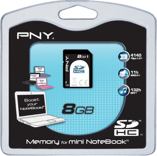 PNY Mini Notebook memory cards are available in 8 and 16GB and let you store bulky files (movies, photos, backups…), meaning you can get the most out of your computer!