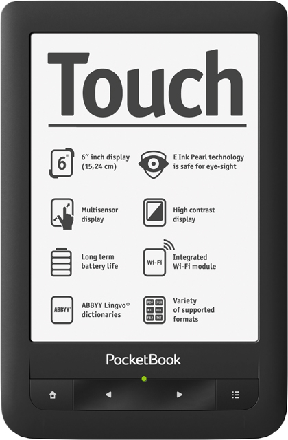 The PocketBook Touch model is a device for reading which combines all the best and most important characteristics of a modern reader. The elegant and slim case, smooth back panel and high-quality materials and assembling of the PocketBook Touch provide a tactile sensation of comfort and pleasure when using the device.