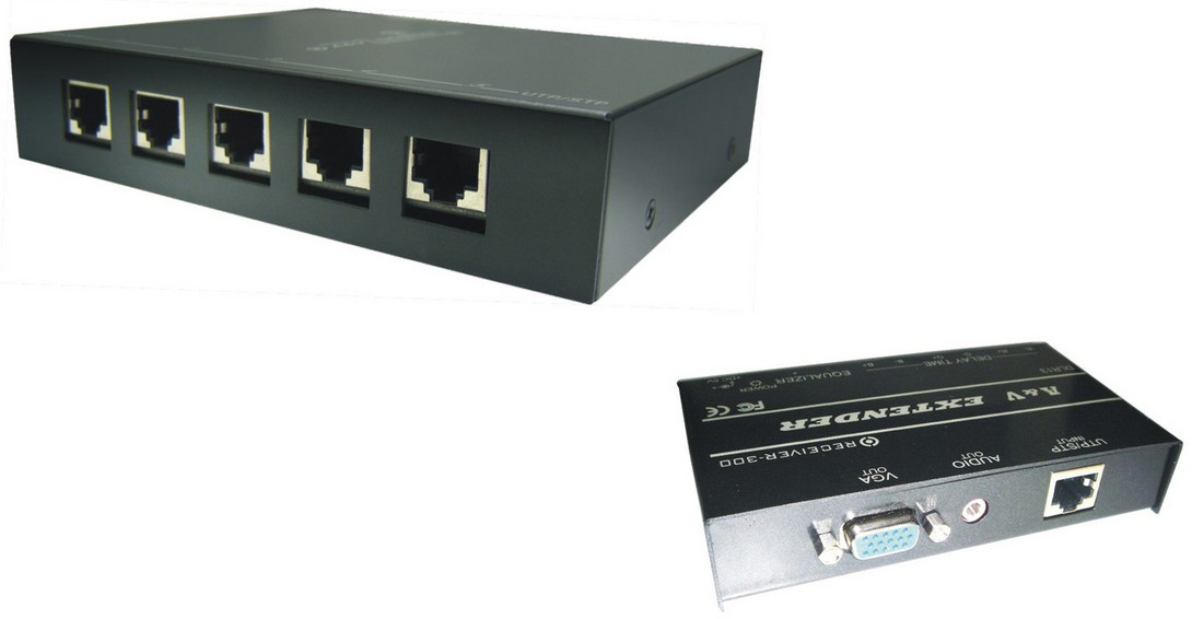 One to Multi Audio & Video Extender, 1280 x 1024 pixels, Transmitter: 1x VGA In, 1x 3.5mm Audio In, 1x VGA Out, 5x RJ45 Out, 1x 3.5mm Audio Out, Receiver: 1x RJ45 In, 1x VGA Out, 1x 3.5mm Audio Out, 300m