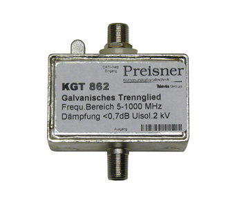 Preisner KGT862. Connector 1: F, Connector 2: F, Gender: Female/Female. Colour of product: Silver, Material: Metal, Plastic. Width: 65 mm, Height: 60 mm, Length: 3 cm