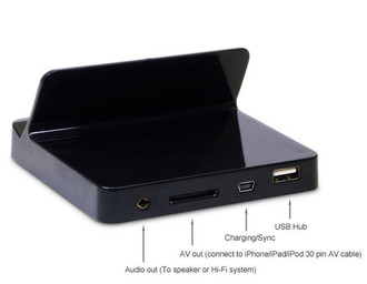 - Connect the dock to a stereo or speakers using an AV cable or a stereo audio cable to play music from iPad.
