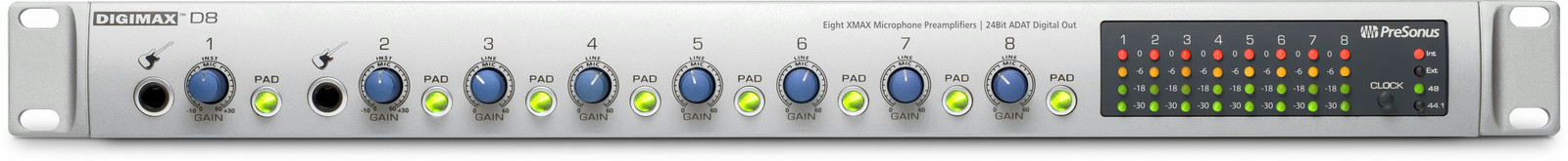 In addition to its eight rear-panel mic inputs, the DigiMax D8 offers two front-panel instrument inputs so you can conveniently plug guitars into your system. All outputs are in the rear, keeping the wiring out of your face.