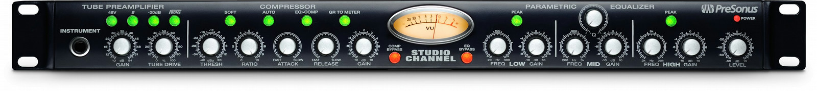 One of our newest signal processors, the versatile Studio Channel provides tube preamplification, dynamics processing, and EQ and takes the channel-strip concept in a bit different direction than does its older sibling, the Eureka.