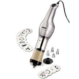Silver Cookiemaker Piping-spout for dough or cream - make cookies quickly and artistically, create fun food, decorate tarts and desserts or use for all kinds of fillings. Makes enough cookies to fill a baking tray in less than 2 minutes! Comes with 12 cookie moulds and 3 universal spout heads for mousse, whipped cream, synthetic cream and fillings. All the accessories are dishwasher-proof.
