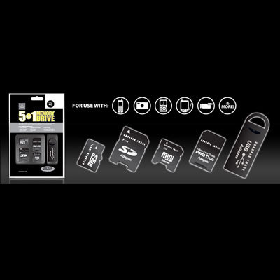 The 5-in-1 Memory Drive is a versatile device that can be used to save & share files on your camera, mobile phone, MP3 Player, computer and more! This all-in-one kit features a single Micro SD (Secure Digital) memory card with four adapters (SD, Mini SD, Memory Stick PRO DUO and USB) that allow it to work with practically all your electronic devices with SD memory - cell phones, digital cameras, media players, photo viewers, gaming devices and more.