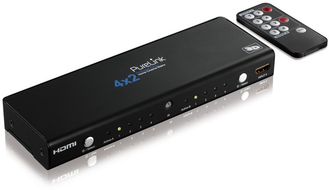 PureLink's PS420 Home Cinema video matrix has been developed to make it easier to use your A / V equipment. It allows four separate HD video sources to be connected to two HDMI or DVI screens and switch between them. The S / PDIF digital audio output (coaxial & optical) make it easier for you to use the digital audio of the four source devices by connecting a Koaxialaudiokabel or an optical audio cable to an audio system that does not support HDMI. You also can use the new 3D feature which make 3D sequences enjoy even easier. Thanks to the splitter and matrix function can be connected to the same source device two HDTVs (or projector); addition, any HDTV (or projector) to use one of the input source components individually. The PS420 Matrix Switcher has further a selection function with eight modes of recognition. By selecting the various modes, you can select the video and audio output format.